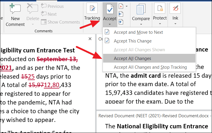 Step 14: If you wish to accept all changes simultaneously, go to the Review tab, click on the Accept drop-down menu in the Changes group, and select Accept All Changes. You can also explore other options based on your needs.