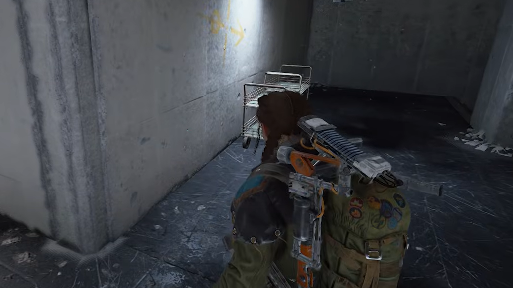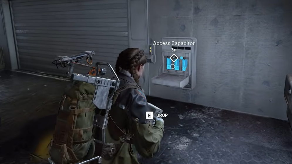 From the underground lobby, follow the blue line painted on the floor. It leads southeast and then curves south through a hallway until you reach a massive shuttered door. A battery terminal sits to the right of this door, and it needs three capacitor batteries inserted before the door will power up and open.