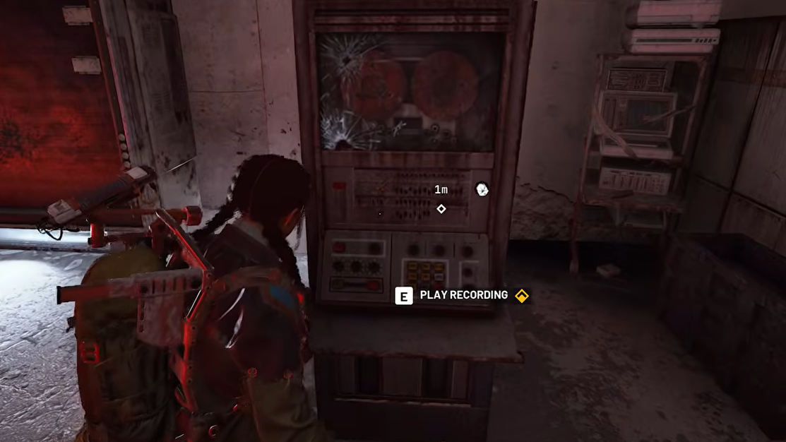 Step 1: Enter the red room and head to the back-right corner. You'll see an old terminal next to the large screen on the wall. Interact with the "Play Recording" prompt. The screens at the front of the room will activate, and a short recording will play, satisfying the Project Heartwood records objective.