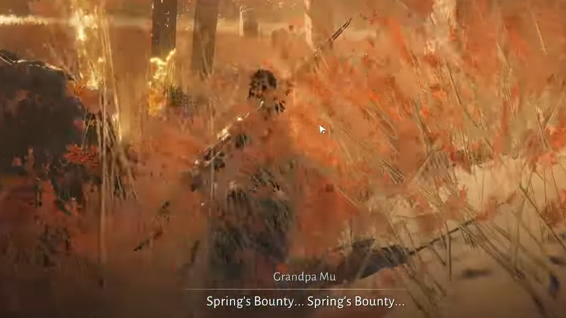 The standard quest path has you speaking to each Mu without being able to hand over Spring's Bounty. However, the wine can be obtained separately. A merchant NPC named Tang Qi in Karez carries Spring's Bounty, and you can steal it from him using the Skill Theft mechanic. Players have reported finding four bottles of the wine, but noted there are five Mu family members total (including Grandpa Mu), so the interaction may not cover everyone. What happens if you bring the wine before speaking to all four Mu's remains an open question — the quest still completes through the eavesdropping sequence regardless.