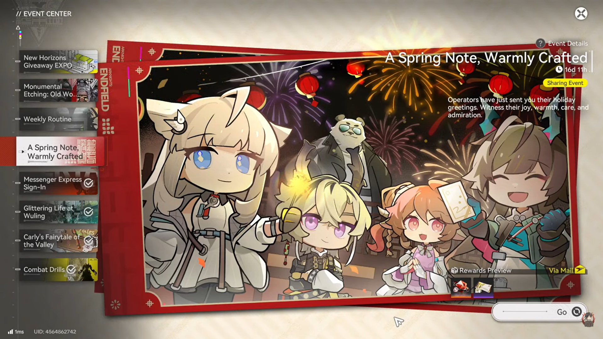| Steps to Sweet Success | Feb. 16, 17, & 21, 2026 | Springfest Pastry (recovers 40 Sanity, permanent item), Mark of Perseverance, Operator Gifts ×3 per mail |