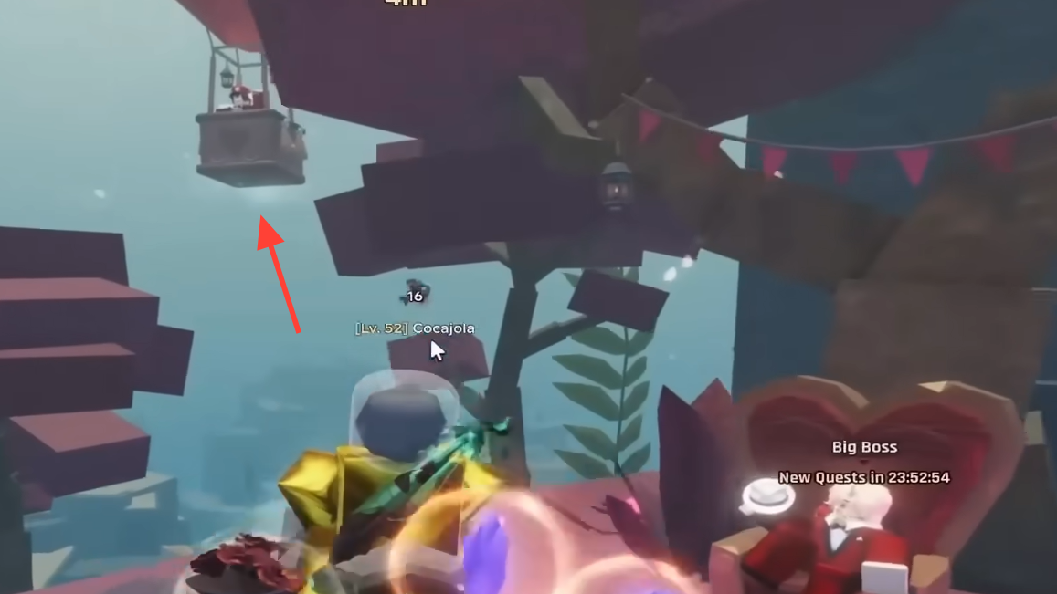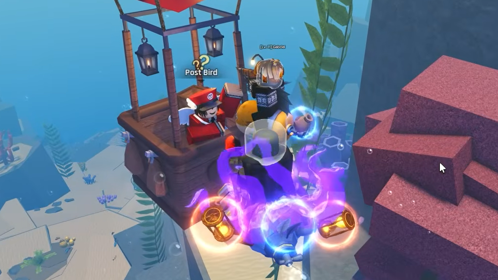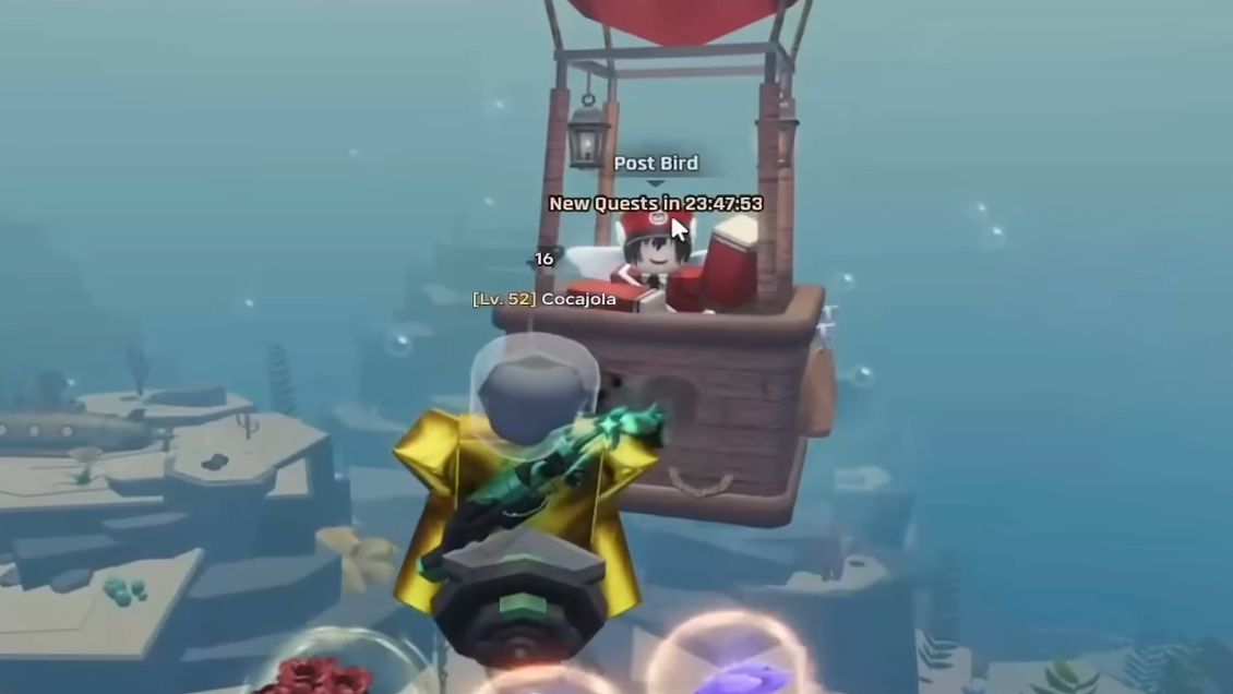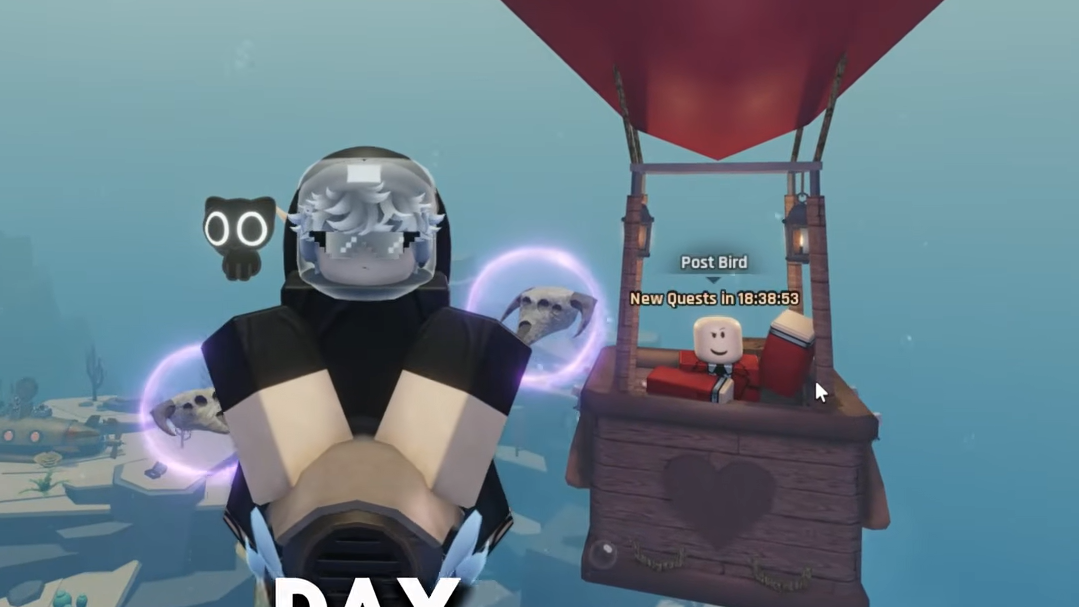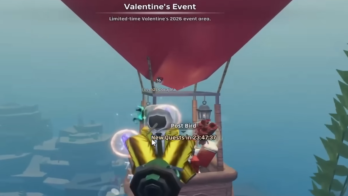 Post Bird floats in a large balloon just to the left of the Big Boss NPC inside the Valentine's Event zone. To reach the event area, head behind the leaderboard near the Forgotten Deep safe zone and look for the sign labeled "Valentin's." Dive into the sea from that spot, and you'll arrive at the event zone. Look up and to the left of Big Boss to spot the balloon.