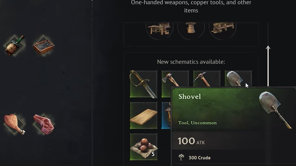 To unlock the Shovel recipe, smelt a Copper Ore into a Copper Bar at your Furnace, then pick up the Copper Bar. This unlocks several new crafting recipes at your Workbench, including the Shovel. Craft it before heading to the quest location.