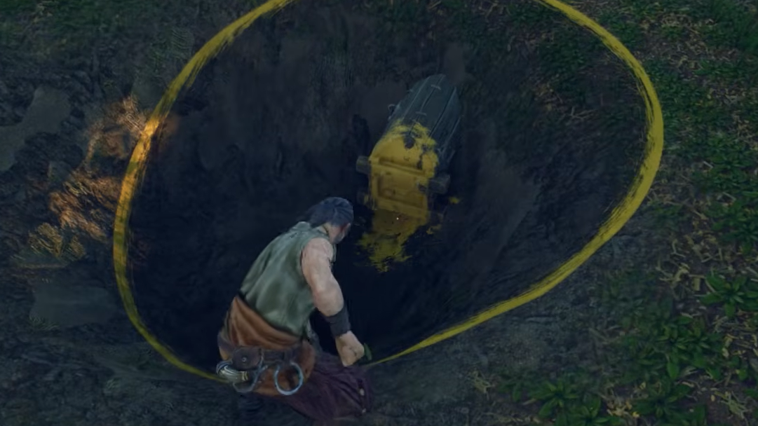 Once you dig in the correct spot, a chest will appear on the ground. Interact with it to trigger the combat encounter.