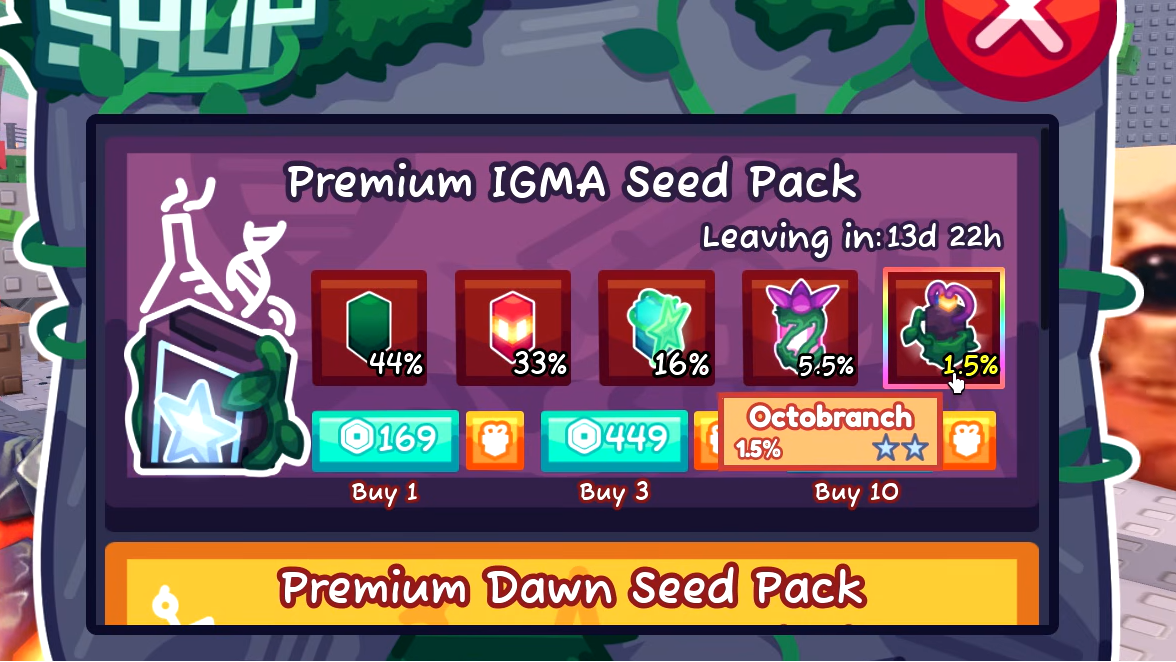The Premium IGMA Seed Pack, awarded for completing all 40 levels, has improved odds and a lower pity threshold for the rarest seed, the Octobranch. Premium packs can also be purchased with Robux in the in-game shop, with bulk discounts for buying multiple packs at once.
