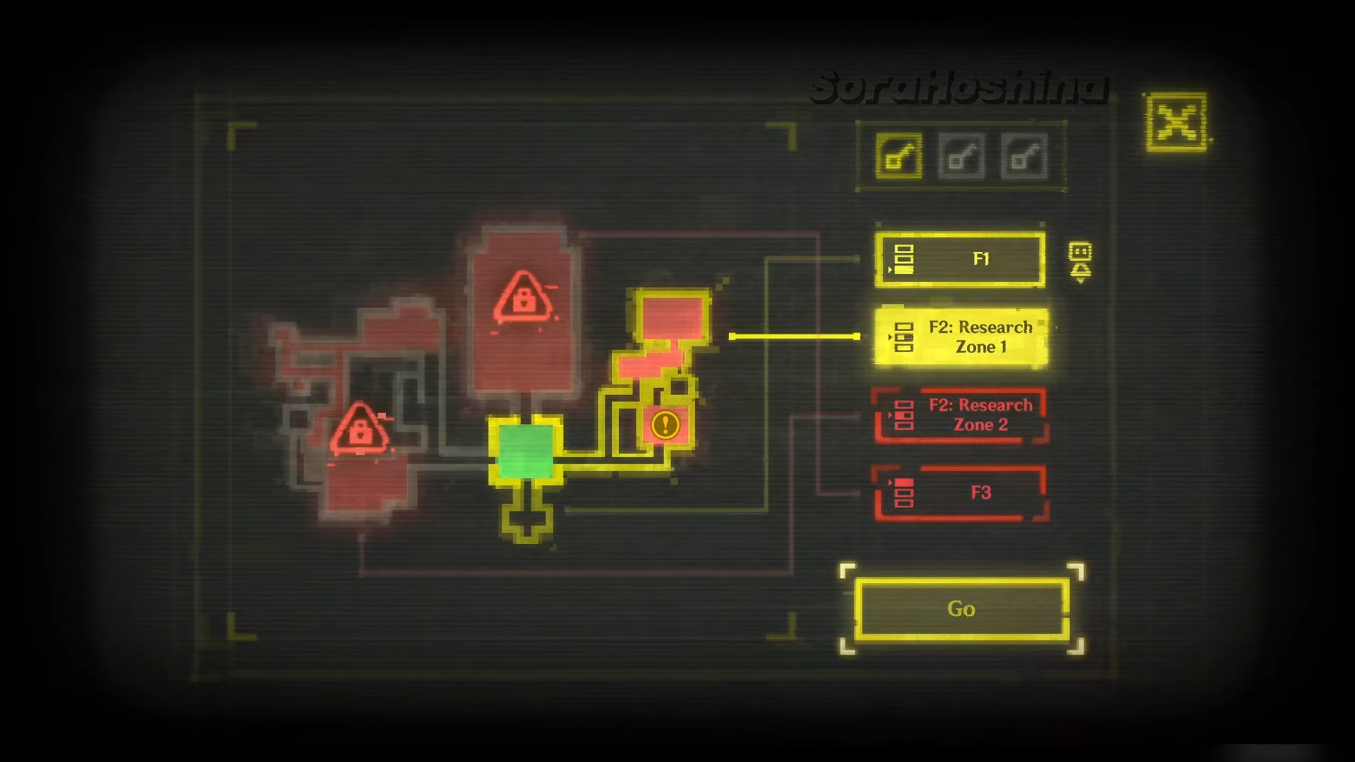 Step 2: Continue to the central control room and interact with the Bunker Access Terminal Server. The display shows a floor map with three levels. At this point, your current key card only allows access to F2: Research Zone 1.
