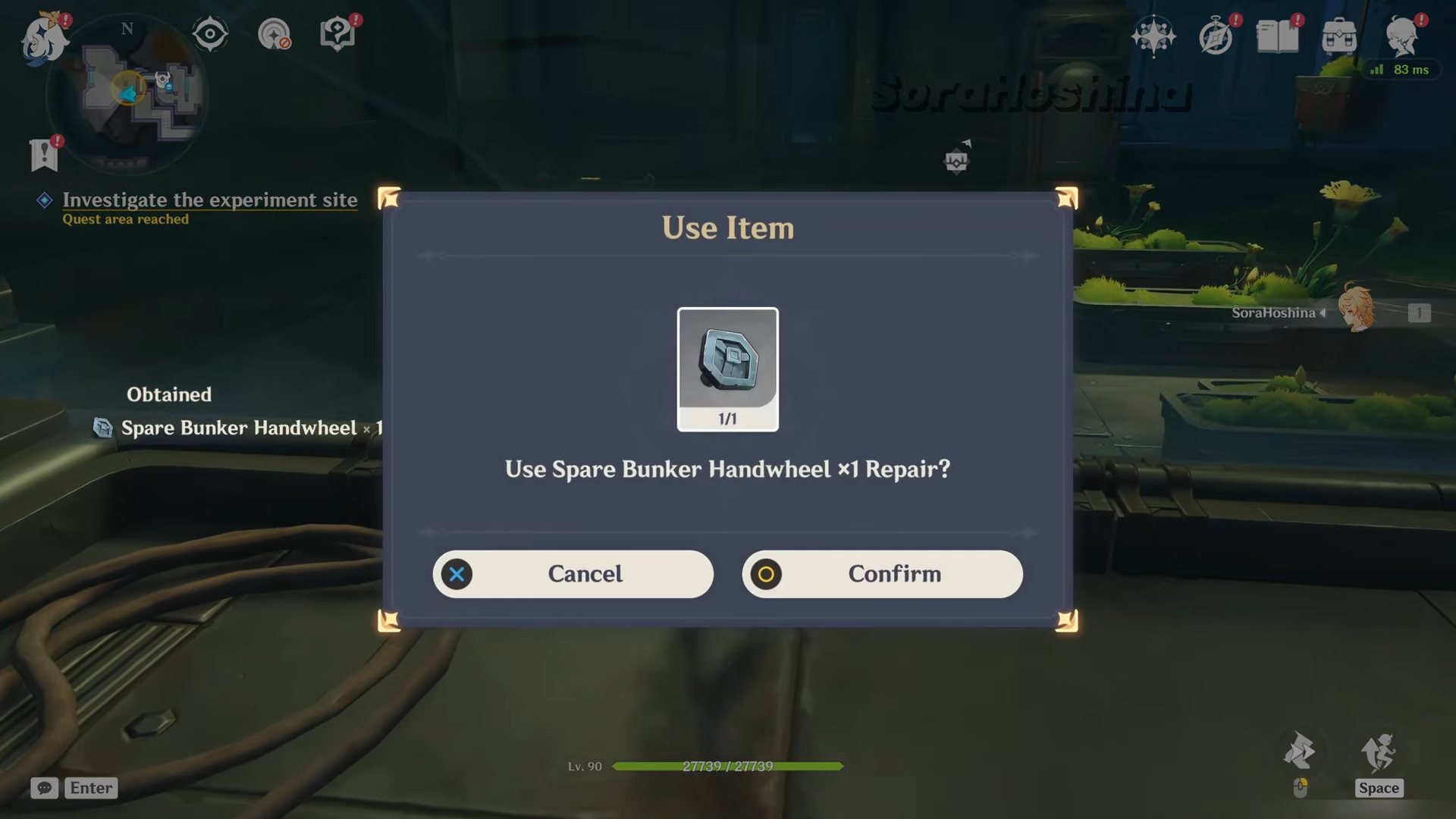 Step 4: In the new room, pick up the Spare Bunker Handwheel valve from shelves near a floating terminal. Install it on the empty valve assembly indicated by an arrow, then interact with the central control terminal. The system now demands manual adjustment of four valves deeper in the experiment site.