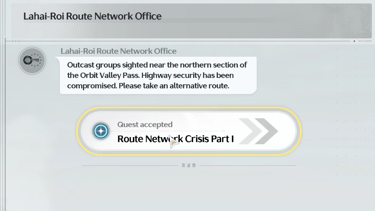 Both Route Network Crisis quests take place in Lahai-Roi and only become available after specific reconstruction milestones. The chain works like this: