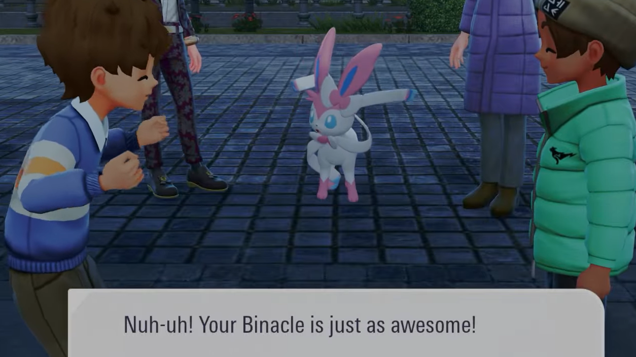 Step 2: Approach them and start a conversation. They turn out to be Canari superfans arguing over the comedy show Canari Comedy Whiz. Let Calma and Sylveon comment, then exhaust the dialogue. Once the scene finishes, this quarrel counts as resolved.