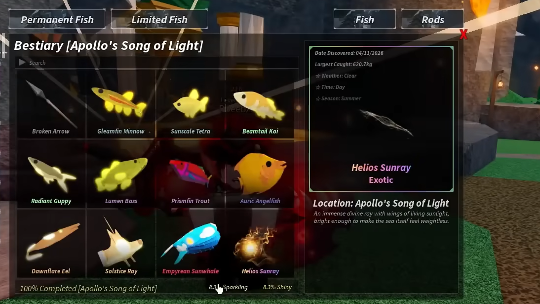 Quick answer: Eight of the 12 fish are catchable at any time within Apollo's Song of Light. The remaining four — Radiant Guppy, Imprian, Sun Whale, and Helios Sunray — only appear during or after the Solar Chorus event, which requires catching 25 legendary fish inside the light beams while all mirrors face the seal.