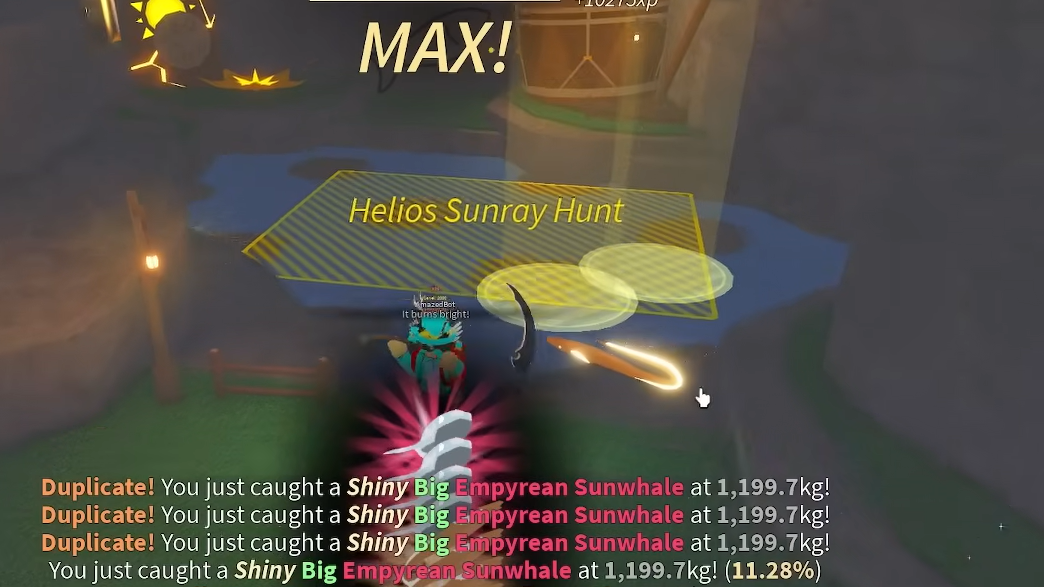Once the Solar Core spawns in, the stone tablets around the area will illuminate. That's your visual confirmation that the event is active. Keep fishing inside the beams, and a Helios Sunray hunt will emerge from the spot where you're casting. The Helios Sunray functions as a boss encounter with a mini-game mechanic you need to clear to progress.