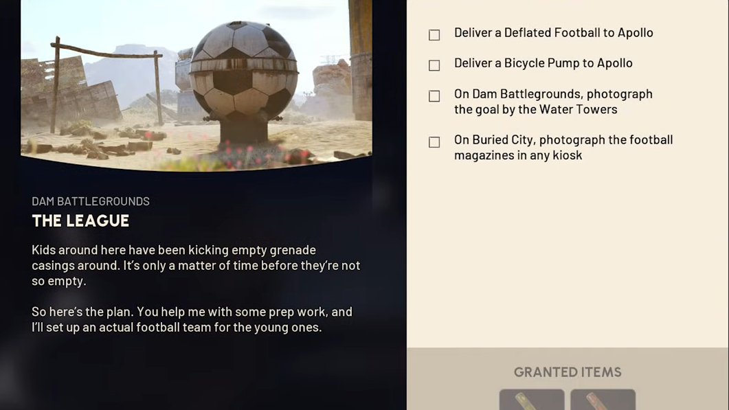Quick answer: Deliver one Deflated Football and one Bicycle Pump to Apollo, photograph the wooden goal at the Water Towers on Dam Battlegrounds, then photograph the football magazines inside any usable kiosk in Buried City. The quest completes as soon as all four objectives are ticked and the journal shows The League as finished.