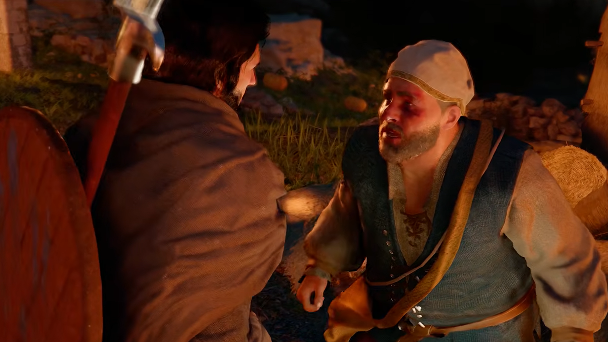 Head to the farm at the quest marker in Springtide Mill. Bremer is the man in a blue shirt — he'll be sitting down near the marker once any nearby strangers have moved on. Lock onto him and start the conversation. He'll explain that bandits stole his cattle, leaving him with nothing.