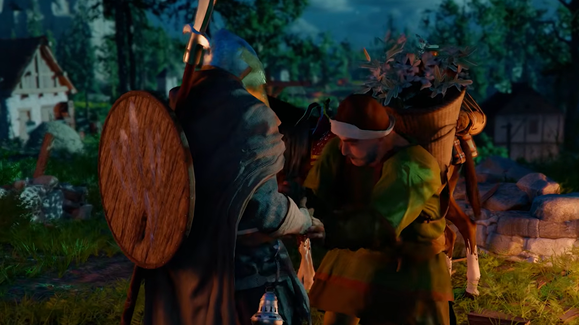 After Bremer finishes talking, a new marker appears down the road. The witness is a Herbalist standing on the corner. Lock onto him and interact, but be ready to part with one copper coin for the information. Once you pay up, he'll mount his horse and offer to lead you to where he last saw the bandits.