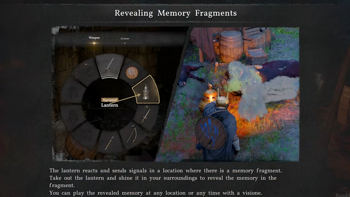 Step 1: Walk toward the center of the bandit camp. Watch for your lantern to start glowing blue and emitting a visible pulse. That blue glow is the universal signal that a Memory Fragment is nearby.