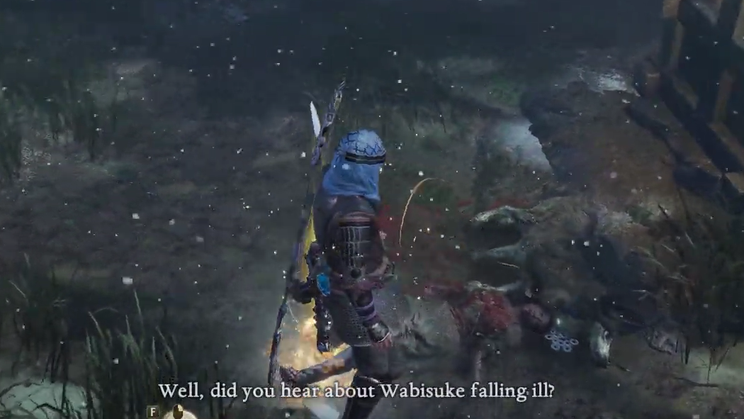 Step 2: Move northeast to investigate a village. Several enemies guard the area, and you'll find additional corpses to examine. Searching them updates the quest with more information, and the spirit suggests Tsubaki may have gone to a nearby temple.