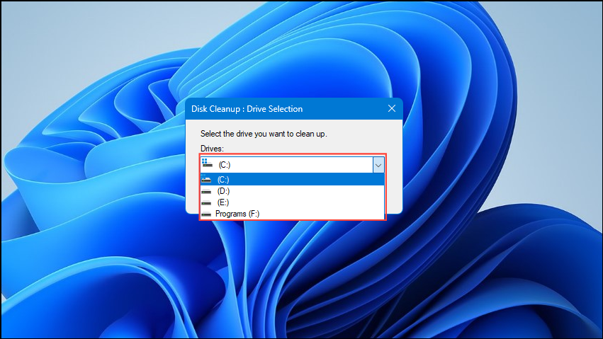 - When the Disk Cleanup utility opens, select the drive from where you uninstalled the program whose temporary files you want to remove by clicking on the dropdown button.