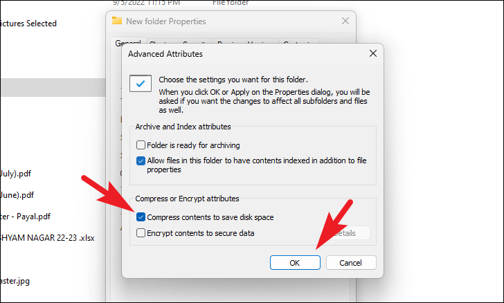 Step 4: In the Advanced Attributes window, check the box next to Compress contents to save disk space, then click OK.