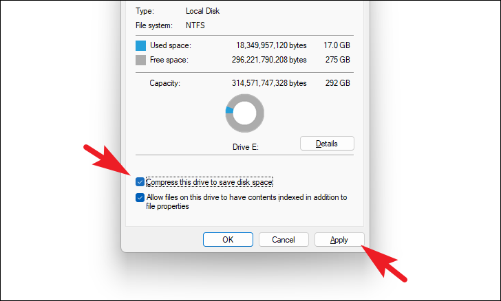 Step 2: In the Properties window, check the box next to Compress this drive to save disk space, then click Apply.