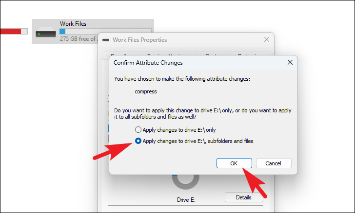 Step 3: A dialog box will appear asking if you want to apply the changes to drive X:\ only or to all subfolders and files. To compress all existing content, select Apply changes to drive X:\, subfolders and files, then click OK.