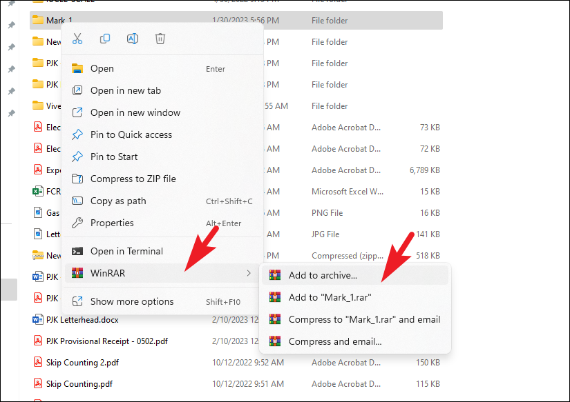 Step 7: Navigate to the file or folder you want to compress using WinRAR. Right-click on it, hover over the WinRAR option, and select Add to archive....