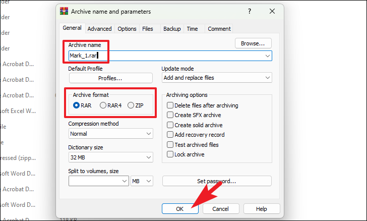 Step 8: In the Archive name and parameters window, you can specify the archive name, select the compression format (e.g., RAR or ZIP), and adjust compression settings. To change the destination folder for the compressed file, click Browse. When you're satisfied with the settings, click OK to create the archive.