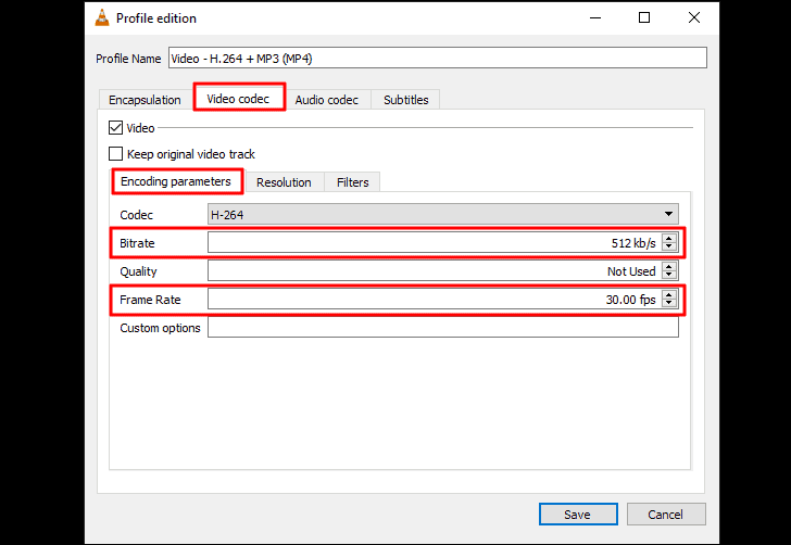 To change the video Bitrate and Frame Rate, navigate to the ‘Video codec’ tab and select the ‘Encoding parameters’ section. Now, enter a lower value for both manually or use the arrows given next to them to increase/decrease the rate.
