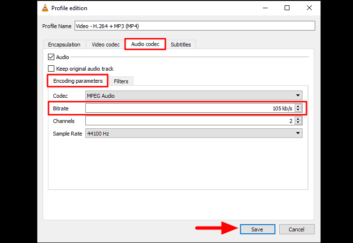 To change the audio Bitrate, navigate to the ‘Audio codec’ tab and then select the ‘Encoding parameters’ section. Next, decrease the bitrate to reduce the size of the video. After you have made the necessary changes, click on ‘Save’ at the bottom to proceed to the conversion process.
