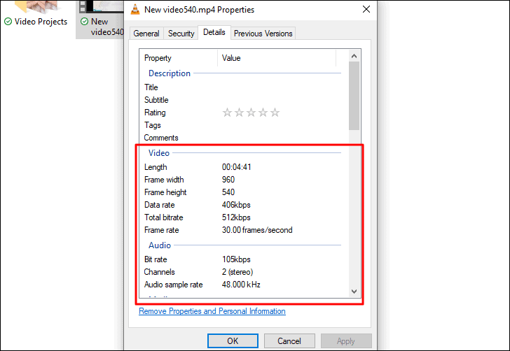 Navigate to the ‘Details’ tab at the top and you can now view the various video parameters such as ‘Width’, ‘Height’, ‘Bitrate’, and ‘Frame rate’.