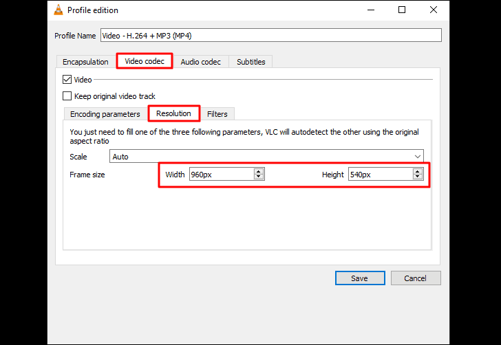 To change the video resolution, navigate to the ‘Resolution’ section of the ‘Video codec’ tab. Next, change the width and height of the frame by either manually entering the new values or using the arrows for each. Also, never change the width to height ratio of a video as it will affect the overall quality.