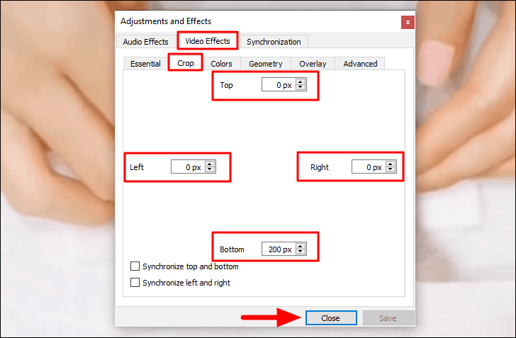 Next, navigate to the ‘Video Effects’ tab from the top and select the ‘Crop’ section under it. Now enter the values in the four boxes to select the part that you want to crop (keep). You might need to adjust the values a few times to get the desired result. Once the values have been set, either press ENTER or click on ‘Close’ at the bottom to apply and save the changes. Also, jot down the value somewhere as they will be used a few steps later.