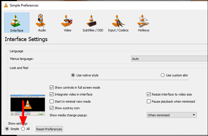 In the ‘Simple Preferences’ window, tick the checkbox for ‘All’ to view the complete settings.