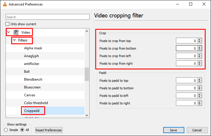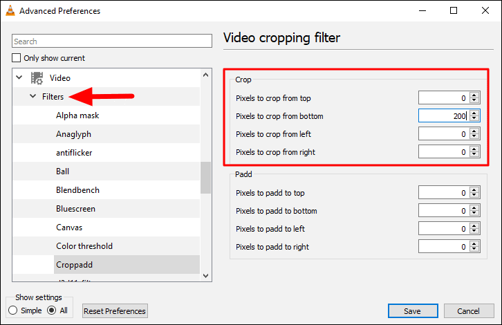 Next, navigate to the ‘Video’ tab on the left and select the ‘Croppadd’ section under ‘Filters’. You will now find two sections on the right, ‘Crop’ and Padd’. Enter the values you noted down earlier from the ‘Adjustment and Effects’ window in the ‘Crop’ section only.