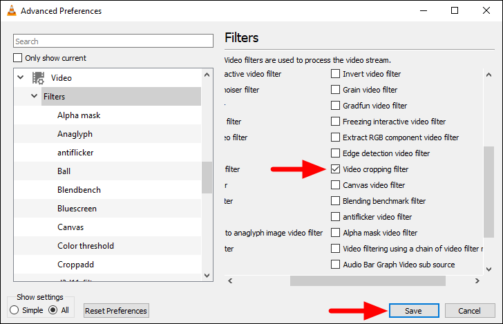 Now, find the ‘Video cropping filter’ on the right and tick the checkbox meant for it. In some versions of VLC, you will find the ‘Video scaling filter’ option instead, but they both perform the same function. After you have applied the filters, click on ‘Save’ at the bottom to apply and save the filters.