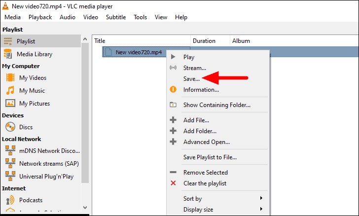 The cropped video is all set, all that is left to do is saving the video. To save the video, press CTRL + L to view the playlist. Next, right-click on the current video that is listed on the right and select ‘Save’ from the context menu.
