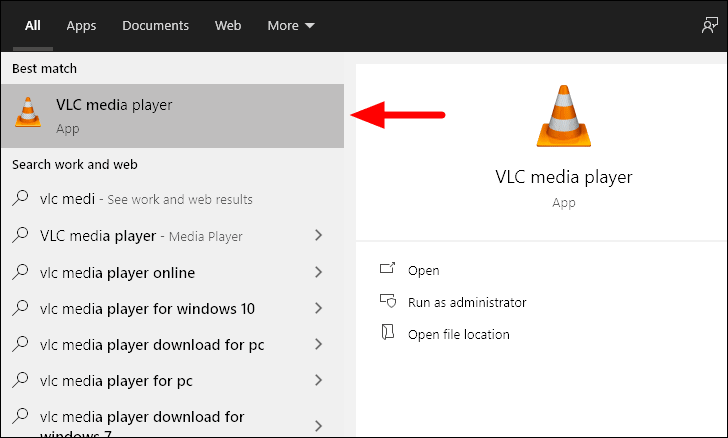 To change the format, search for ‘VLC Media Player’ in the ‘Start Menu’ and then click on the search result to launch the app.