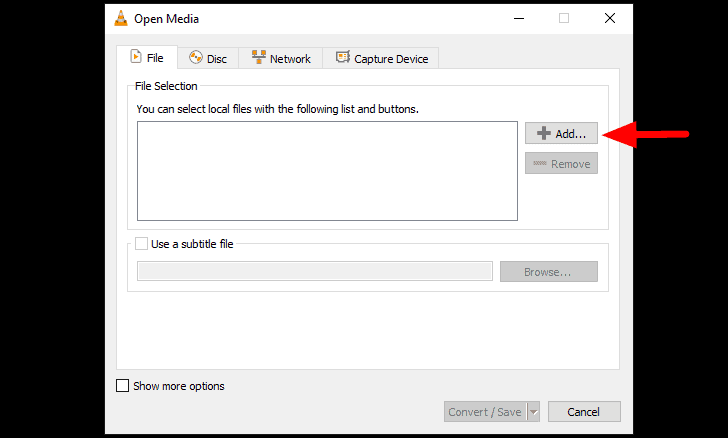 The ‘Open Media’ window will launch. Click on the ‘Add’ option to select and add a video.