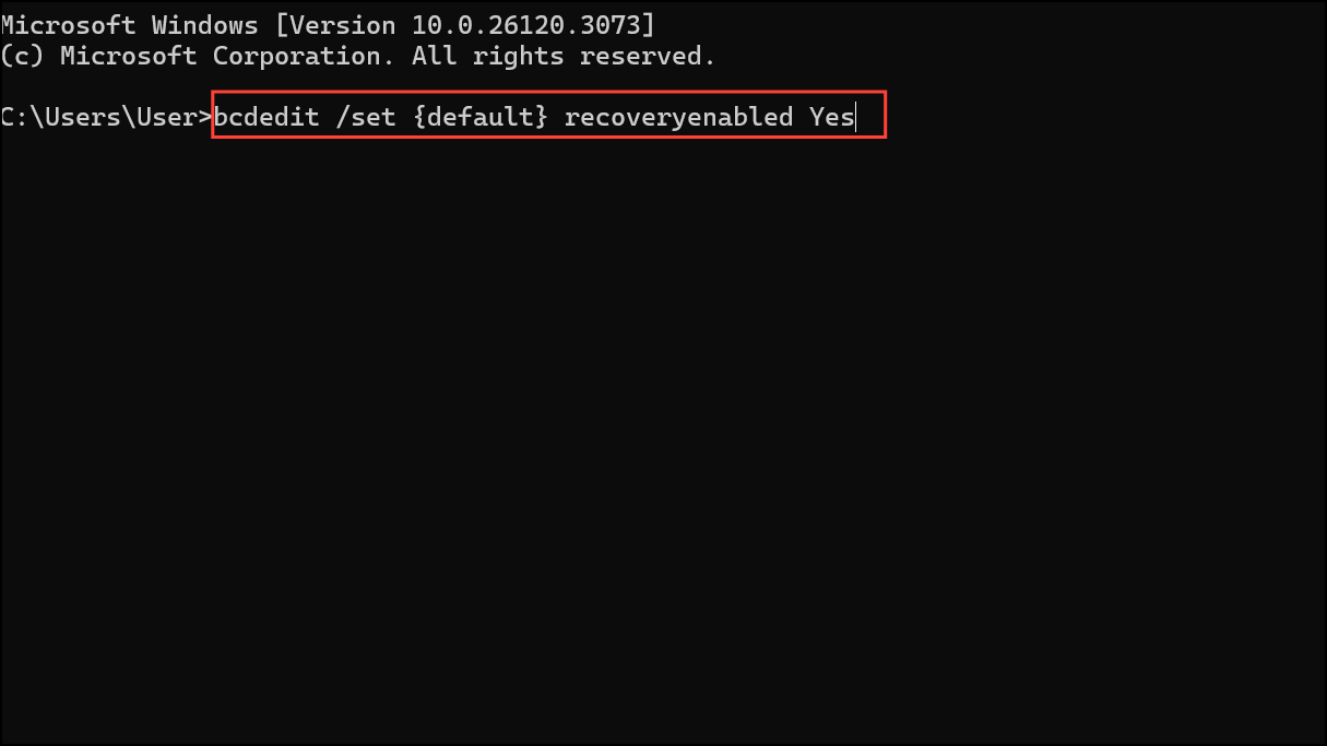 Press Enter to execute the command. This command instructs Windows to automatically initiate recovery procedures when boot failures are detected.