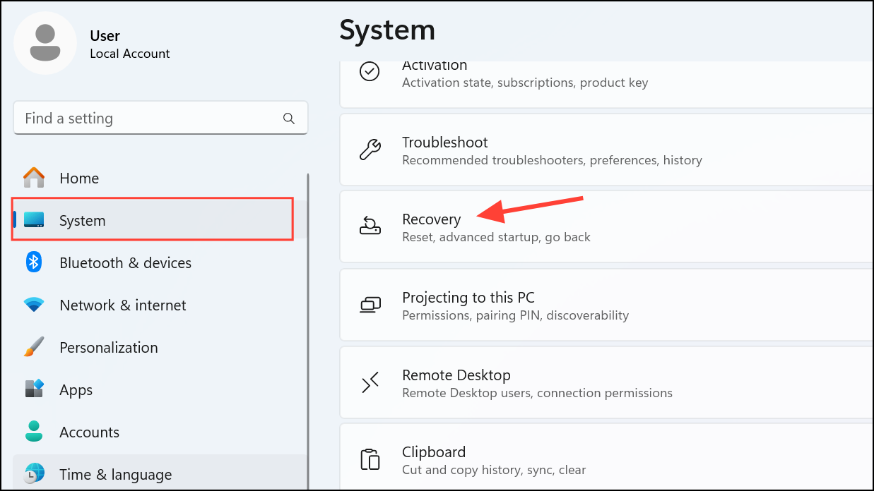 Step 1: Click the Start button and select "Settings." In the Settings window, navigate to "System," then choose "Recovery."