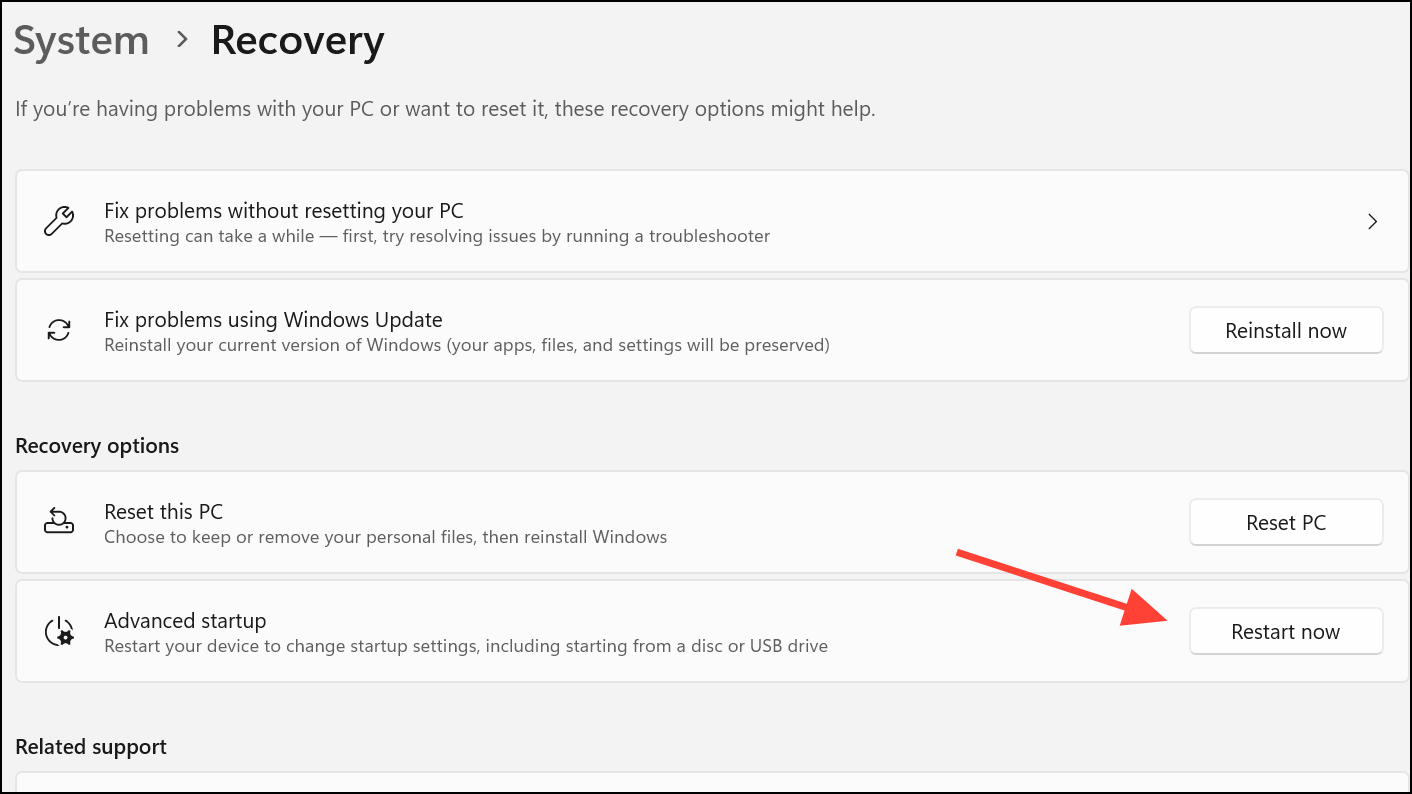 Step 2: Under the Recovery options, locate the "Advanced startup" section and click "Restart now." Confirm your choice when prompted. Your system will reboot into the advanced startup options.