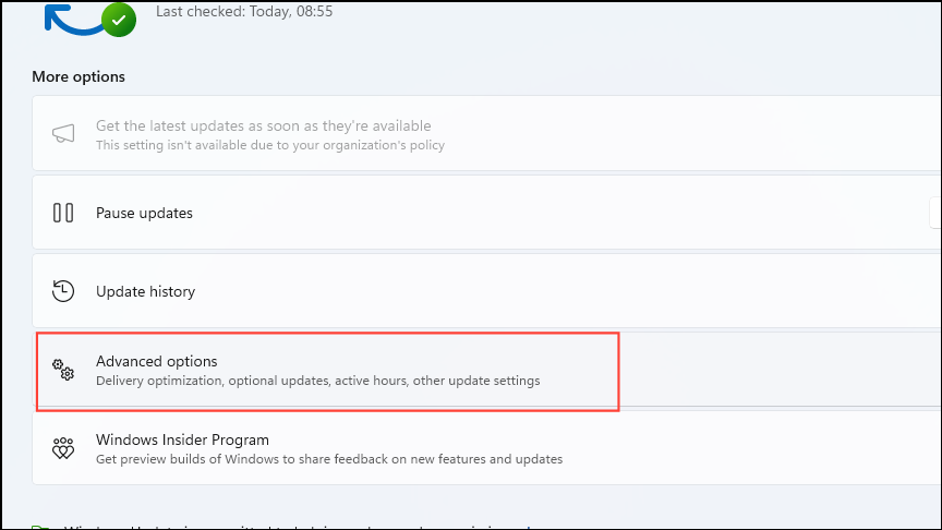 - On the Windows Update page, click on 'Advanced Options'.