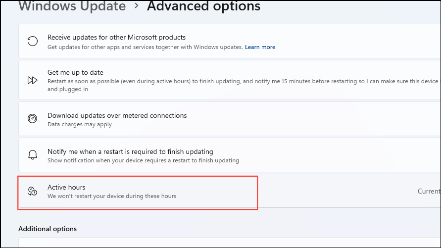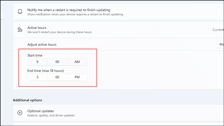 If you wish to prevent active restarts while you are using your Windows 11 PC, you can use the Active Hours feature. This lets you specify a time period during which you will be using your computer and will prevent Windows from installing updates and restarting during that period.