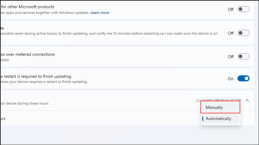 - When the Active Hours dropdown menu appears, click on it and select 'Manually'.