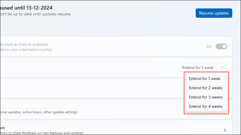 - You can also extend the time period for which you've paused the updates by clicking on the 'Extend for 1 week' button and then selecting the time. You can extend the period for up to four weeks at a time.