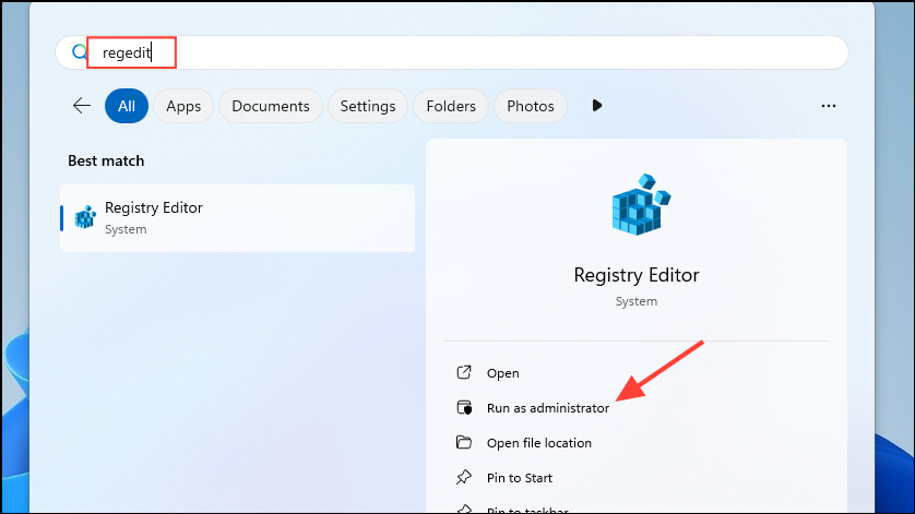 regedit, and click on 'Run as administrator'.