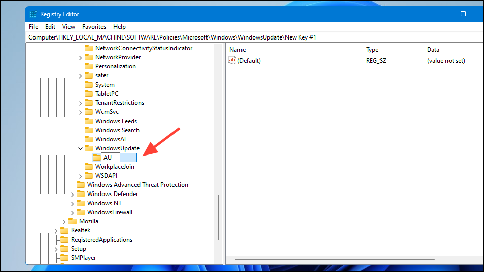- Find the AU folder within the 'Windows Update' key. If it isn't present, right-click on the key, go to 'New', and select 'Key'.