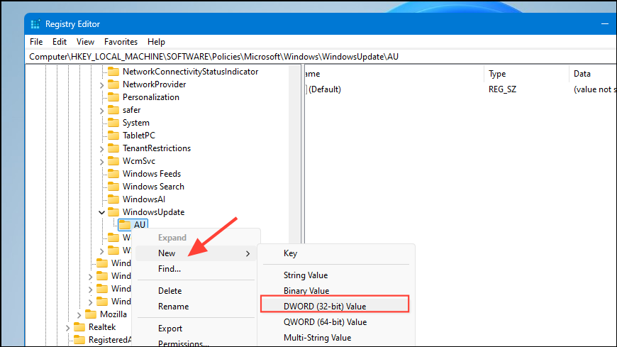 - Now, right-click on the 'AU' key and go to 'New' and click on 'DWORD (32-bit) Value'.