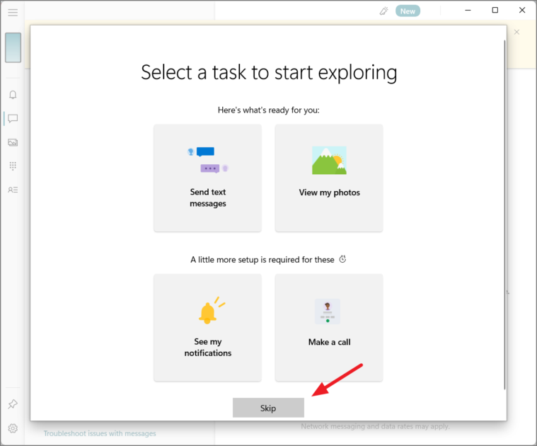 - You'll be introduced to the app's capabilities, including messaging, calls, photos, and notifications. Click Skip to access the main interface.