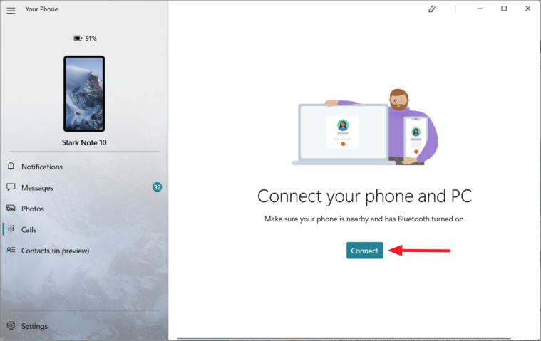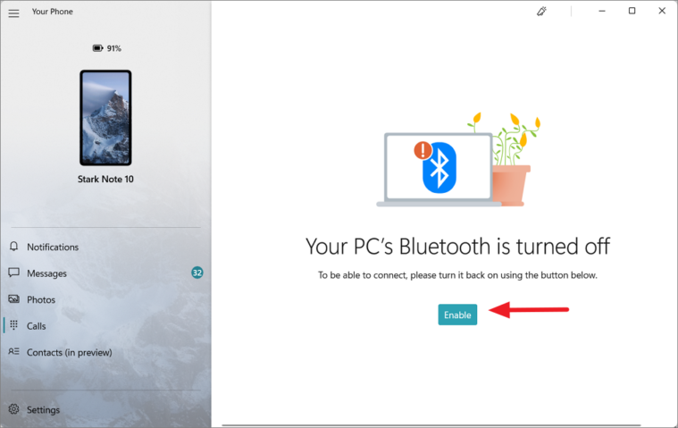 - In the 'Your Phone' app on your PC, go to the Calls tab. If Bluetooth is disabled, click Enable to turn it on.