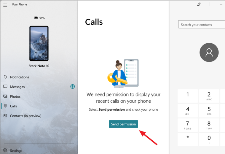 - Your PC will request permission to access call logs and make calls. Click Send permission to send a notification to your phone.